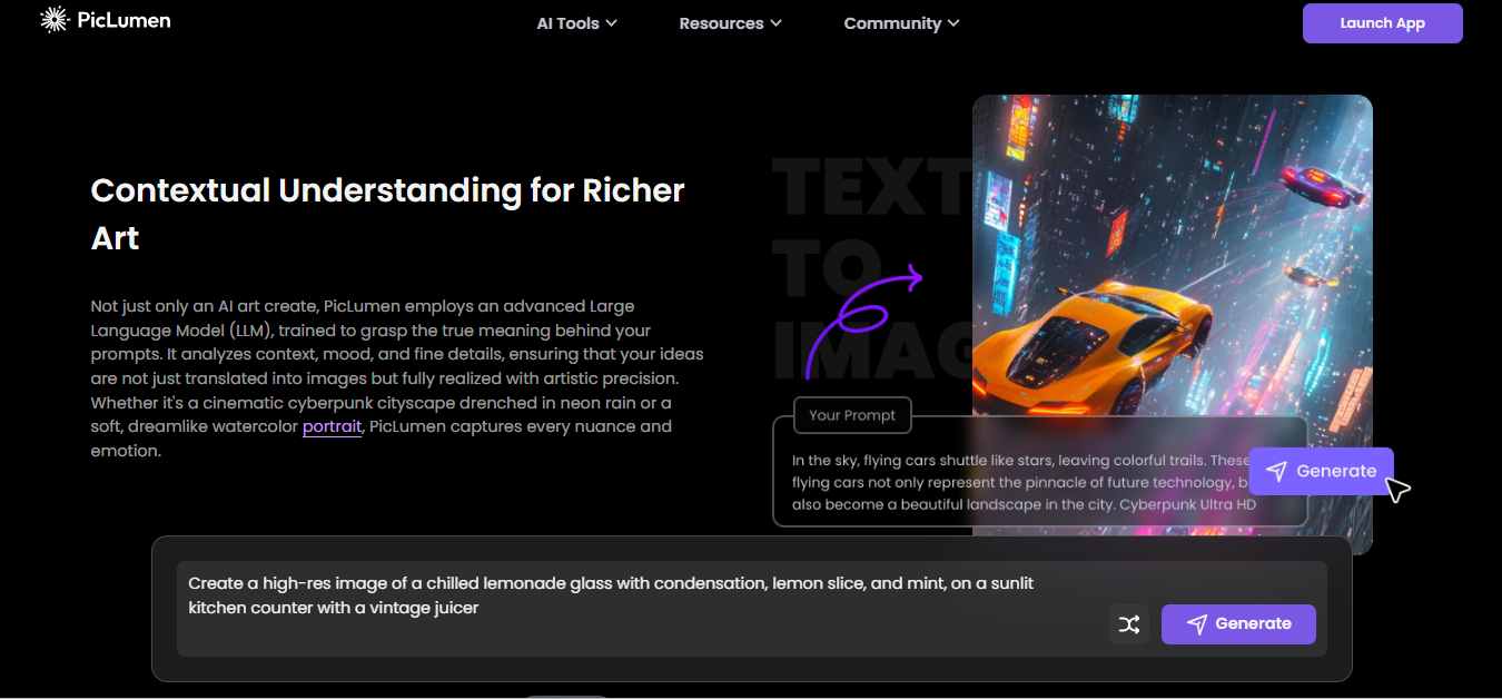 PicLumen’s AI Art Generator has a unique feature since it understands both your written input and recognizes the emotional context you want to express. It doesn’t just generate random images; it understands the underlying emotion and aesthetic you’re aiming for, ensuring the final artwork is not only accurate but visually compelling.